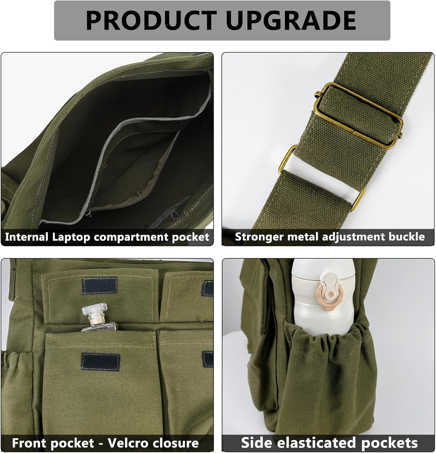 - 【VERSION UPGRADE】Canvas Messenger bag has been upgraded. 1.The adjustment buckle of the shoulder strap has been upgraded to a high-quality metal ring, which is stronger and more durable. 2.The crossbody bag has a specially designed computer compartment inside, which can accommodate a 16-inch laptop. 3.The front pockets ues closure, which effectively prevents items in the front pocket from falling out and is safer. 4.The side pockets of canvas are reinforced with elastic.