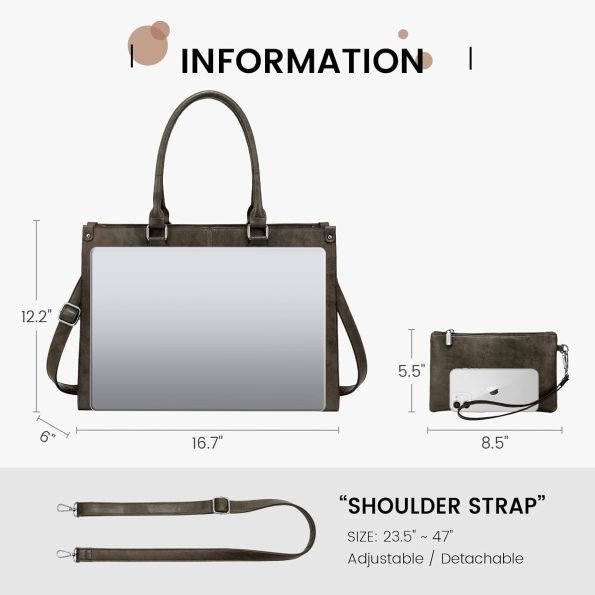 • 👩‍PERFECT SIZE WORK BAG ☛ Work tote bag for women is 16.7″ x 6″ x 12.2″(L*W*H). Net weight: 3 lb. Distance from top handle to the bag: 8”. The adjustable shoulder strap is 23.5~47 inches long. Can be carried in several ways as an office briefcase or handbag, shoulder bag, or crossbody bag as well, which is convenient and comfortable. Suitable for most 13″/14″/15″/15.6″ laptops.