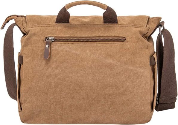 - MULTI-COMPARTMENT: This canvas laptop bag is vintage and multifunctional with lots of pockets. 1 zipper pocket in the front flap; 1 zipper pocket under the flap which is fitted with 3 pen slots, card slots; 1 large main zipper pocket: 1 inner zipper pocket; 1 inner cushion padded laptop compartment; 1 back zipper pocket. A 14-inch laptop, iPhone, wallet, snacks, tickets and magazine will all fit comfortably with room left over for add-ons.