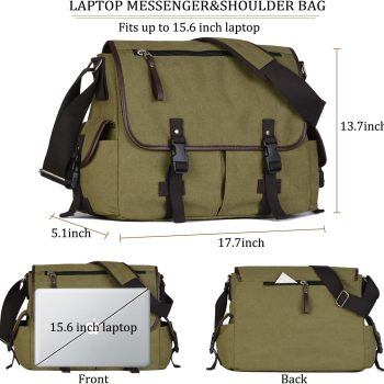 - MULTI-COMPARTMENT: This canvas laptop bag is vintage and multifunctional with lots of pockets. 1 zipper pocket in the front flap; 1 zipper pocket under the flap which is fitted with 3 pen slots, card slots; 1 large main zipper pocket: 1 inner zipper pocket; 1 inner cushion padded laptop compartment; 1 back zipper pocket. A 14-inch laptop, iPhone, wallet, snacks, tickets and magazine will all fit comfortably with room left over for add-ons.
